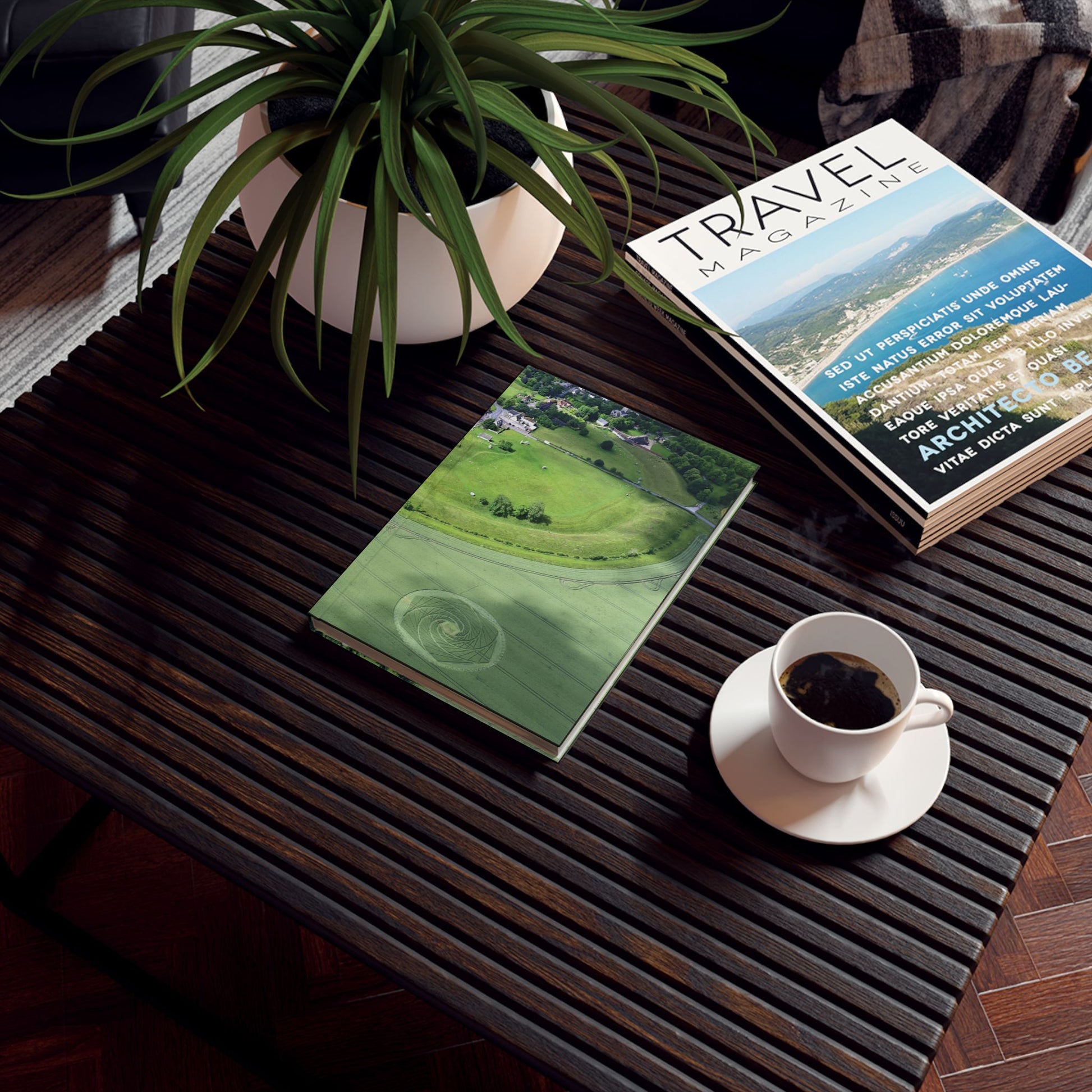 This notebook features an aerial photograph taken by Philippe Ullens in 2021, where a crop circle can be seen quietly resting in the landscape.
